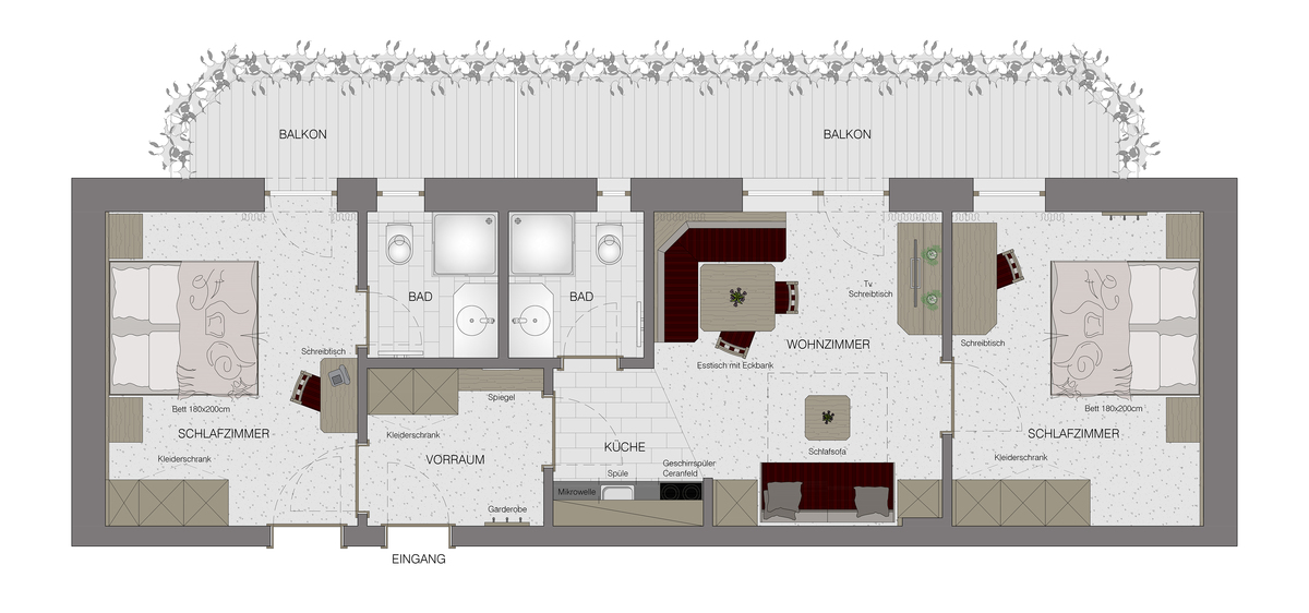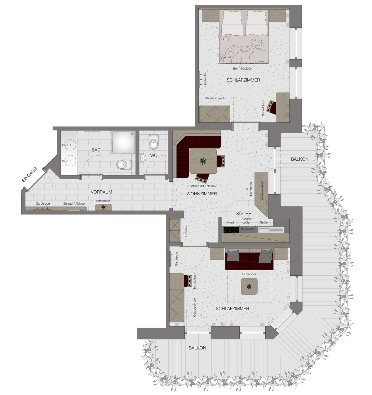 Das Appartement hat eine Fläche von ca. 60 m² und einen großzügigen, sonnigen Balkon mit 15 m².