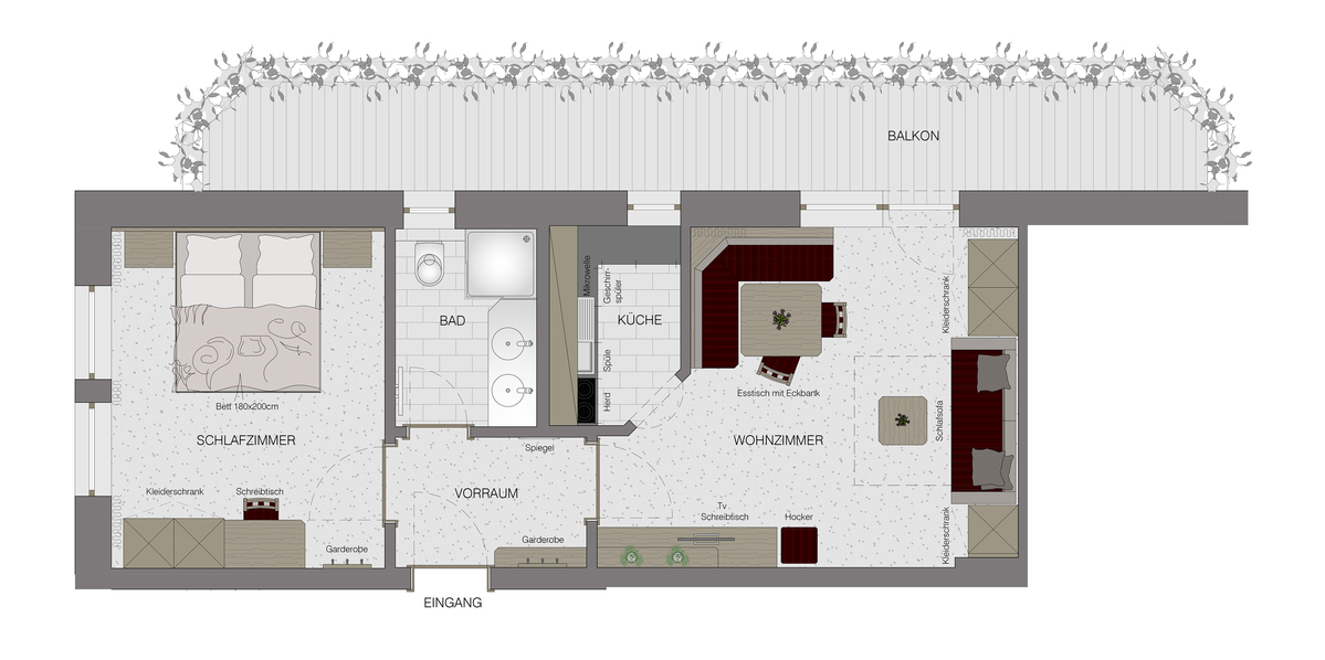 Das Appartement hat eine Fläche von ca. 45 m² und einen großzügigen, sonnigen Balkon mit 12,5 m².