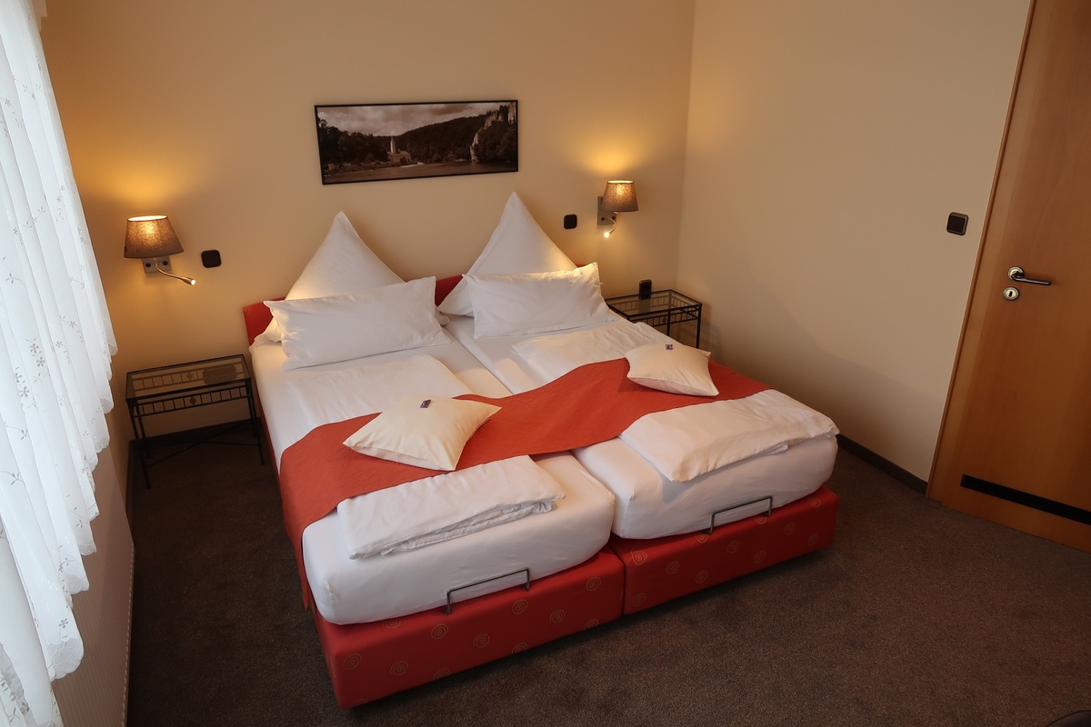 Das Doppelzimmer ist komfortabel eingerichtet. Doppelbett und zusätzliches Einzelbett, Sitzgruppe, TV, WLAN. Der möblierte Balkon bietet eine herrliche Fernsicht und Blick zur Donau. Das Badezimmer mit Dachfenster ist mit Dusche, WC, Fön und Handtüchern ausgestattet.