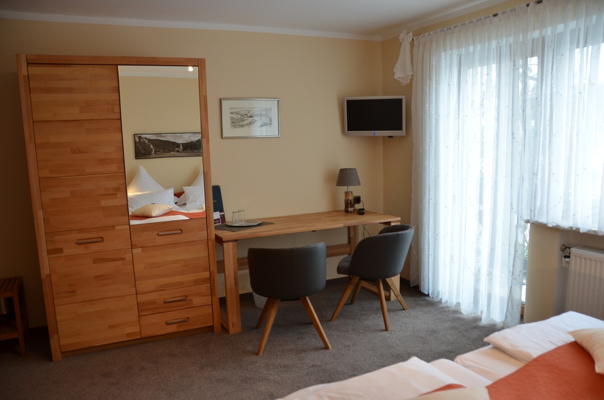 Das Doppelzimmer hat eine große möblierte Terrasse nach Süden mit Zugang zum Garten. Doppelbett ohne Fußteil, getrennte Betten möglich, Schreibtisch und Sitzgelegenheit für 2 Personen, TV und WLAN. Das Badezimmer ist mit Dusche, WC, Fön und Handtüchern ausgestattet.