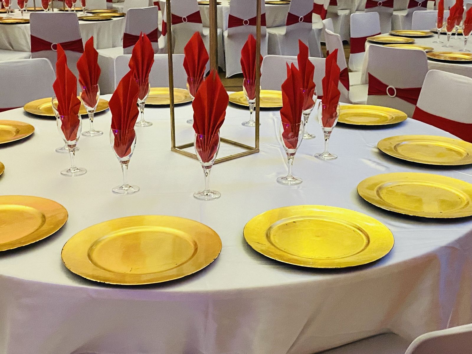 • Auf Wunsch Blumendekoration für die Tische -Menü- und Tischkarten Weiße Stuhlhussen sowie Kerzenleuchter -Auf Wunsch gestalten wir auch gerne Ihren Tischplan
